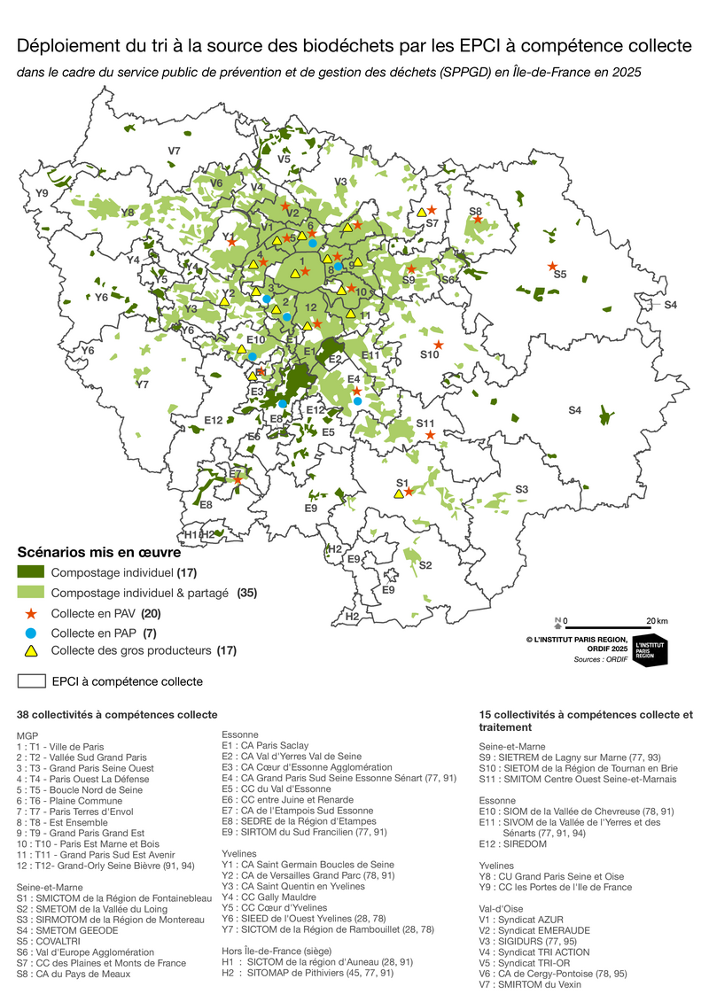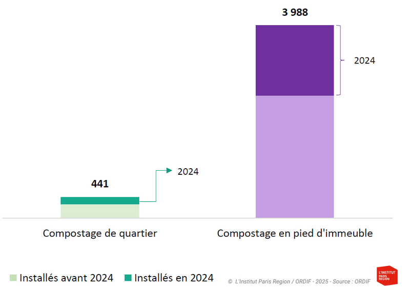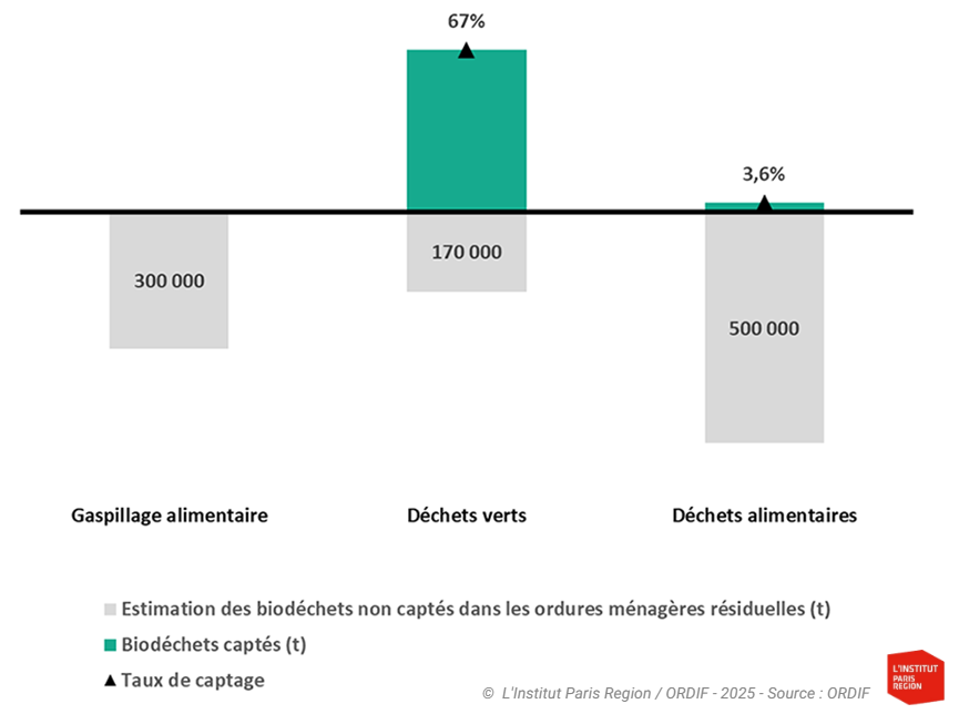 Les déchets alimentaires (restes de préparation ou de repas), représentent environ 520 000 tonnes chaque année dans la région, soit près de 42 kg par habitant, à comparer avec les 19 000 tonnes collectées séparément en 2024 (3,6%). Ce chiffre s’explique, d’une part, par le retard accumulé dans la mise en place effective du tri à la source, et d’autre part par la difficulté des usagers à s’approprier ce nouveau geste, encore peu ancré dans les habitudes dans le contexte particulier d’une densité très forte.