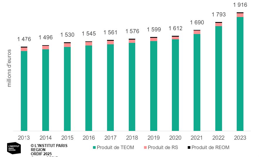 La taxe d’enlèvement des ordures ménagères demeure le mode de financement privilégié par les collectivités franciliennes : 97 % des communes la lèvent directement ou indirectement. Avec un produit en constante augmentation depuis 10 ans, il a atteint en 2023 une valeur moyenne de 151 € par habitant.