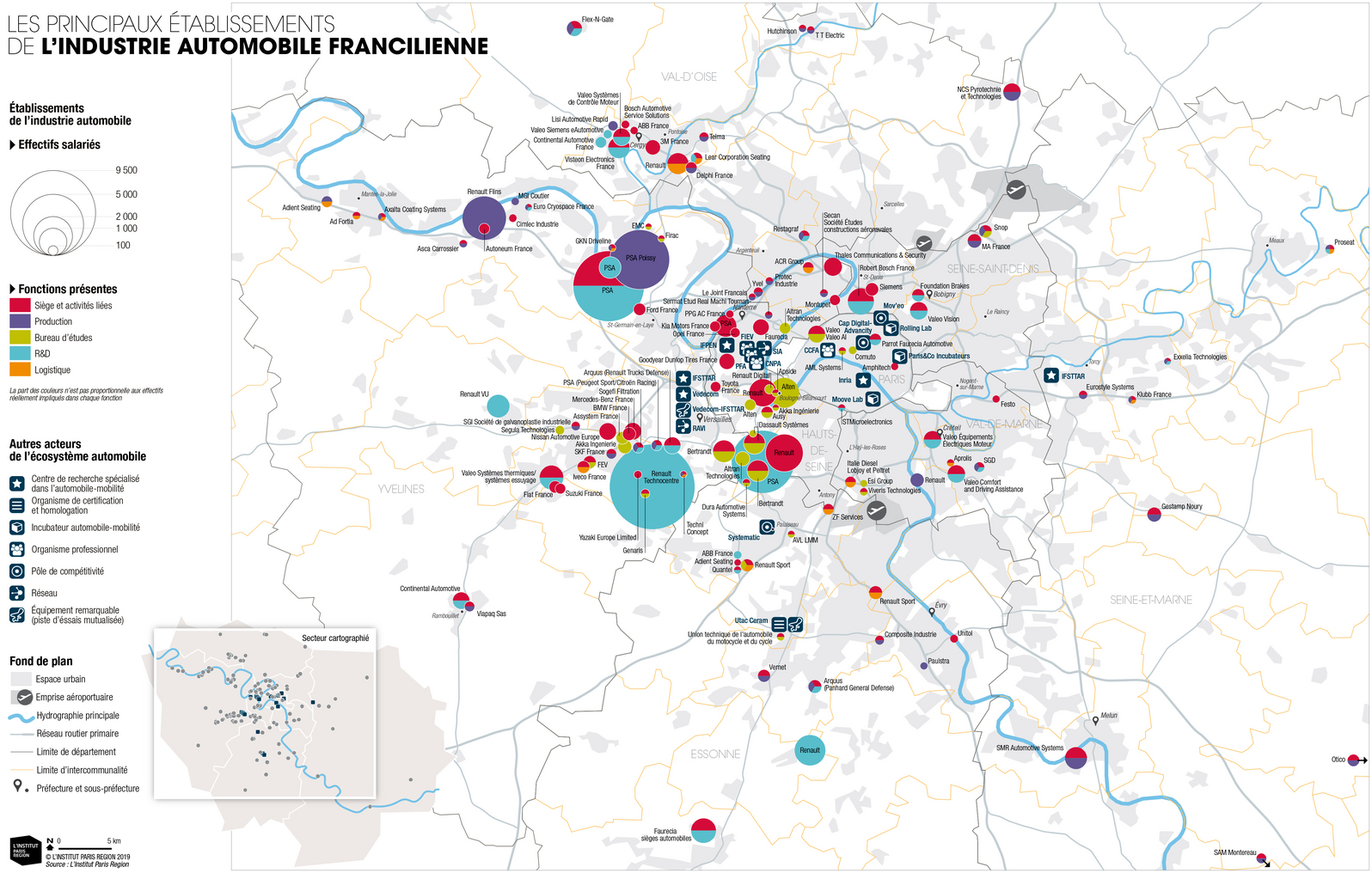 Les deux constructeurs français, l’alliance Renault-Nissan et le groupe PSA, structurent la filière francilienne dont ils constituent la majorité des effectifs (57 %) et marquent le territoire de leurs très grands établissements. De leur côté les équipementiers (Valeo, Faurecia mais aussi de nombreuses entreprises étrangères comme Continental, Visteon, Bosch) représentent 13 % des effectifs de la filière. Au total les acteurs du coeur de la filière emploient 70 % des effectifs de la filière au sein de leurs centres de R&D, sièges et sites de production. Les activités des acteurs franciliens du coeur de la filière sont particulièrement spécialisées dans la conception avec 50% de leurs effectifs, 30 % travaillent au sein de leurs sièges ou sites administratifs et les 20 % restant sont dans des unités de production.