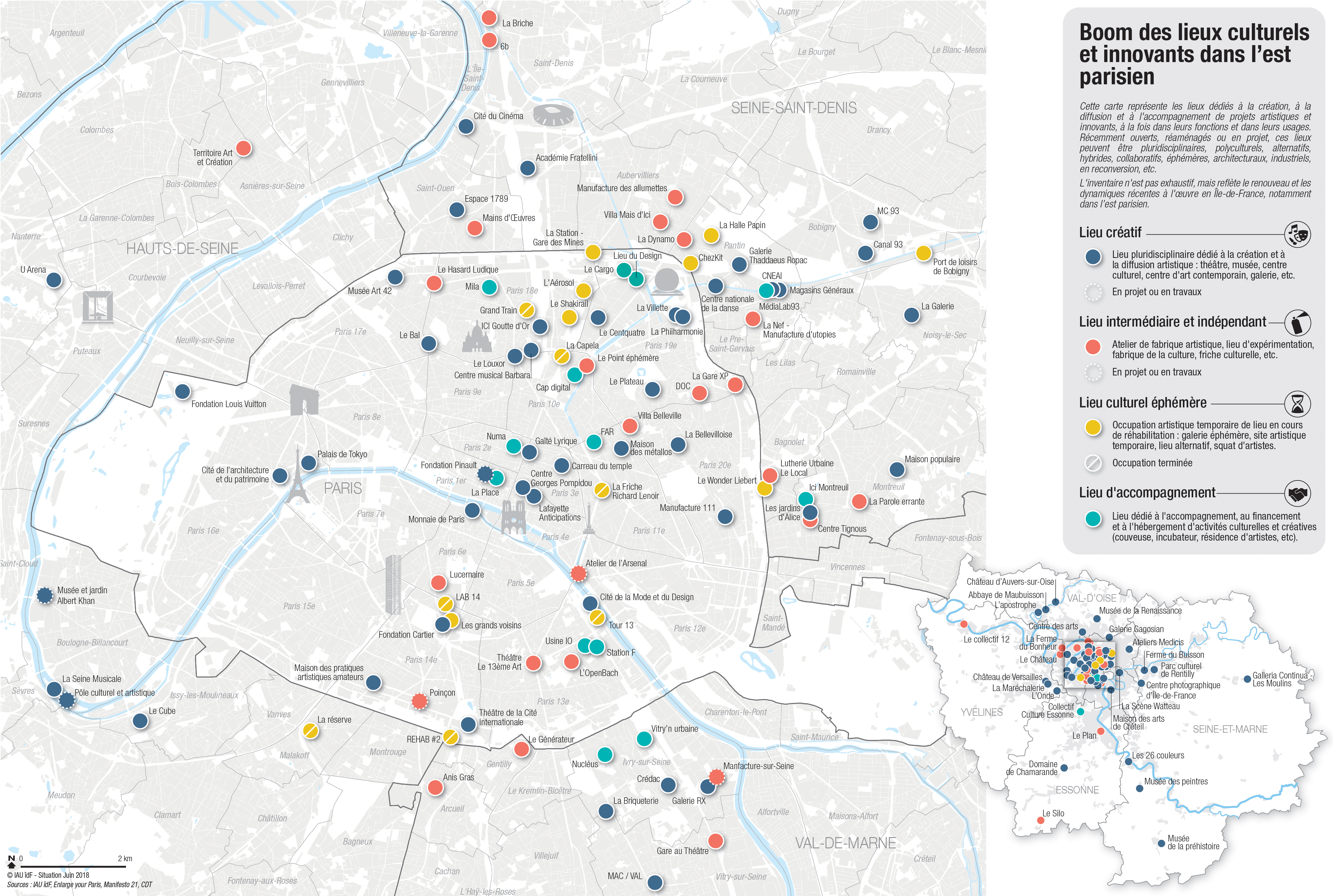 Ce deuxième volet, consacré à l’Île-de-France, explore la relation entre quinze lieux (ou sites) culturels et leurs territoires respectifs. La région offre un paysage culturel riche et aux potentiels diversifiés, que ce soit en termes de participation, de reconnaissance, de développement économique, ou d’attractivité touristique. L’offre culturelle s’y est largement renouvelée et enrichie ces dernières années. Huit études de cas approfondies, centrées autour d’un ou plusieurs lieux culturels franciliens et leur territoire sont proposées : le Pays de Fontainebleau, la Cité médiévale de Provins, le musée de la Grande Guerre du Pays de Meaux, le centre-ville de Versailles, la villa Savoye à Poissy, la Ferme du Buisson à Noisiel, le Centre des arts à Enghien-les-Bains, le Centquatre-Paris. Des focus thématiques, qui présentent des enjeux spécifiques et tendances récentes, complètent l’analyse : l’essor des lieux culturels éphémères, souvent hybrides (6b, Station-Gare des mines…), la valorisation du street art (Vitry’n Urbaine), la culture au service de l’animation d’un centre-ville (la Rue des lumières à Évry), le rôle croissant du privé (Fondation Louis Vuitton), des sites patrimoniaux cherchant à attirer plus de touristes (châteaux d’Écouen et d’Auvers-sur-Oise), des gestes architecturaux forts (la Seine musicale sur l’île Seguin), etc. Autant d’exemples qui montrent que les lieux culturels sont des atouts pour les territoires qui les accueillent : ils génèrent des retombées sociales (émancipation et liens sociaux), économiques par le tourisme et les industries culturelles et créatives. Ils sont des acteurs de la transformation urbaine et apportent des réponses qui peuvent alimenter une réflexion plus globale sur leur rôle structurant pour les territoires, aussi bien urbains, péri-urbains que ruraux.