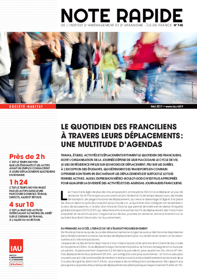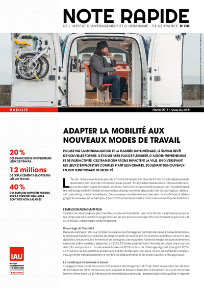 L’Île-de-France, grande région métropolitaine, représente plus de 6 millions d’emplois. Chaque jour plus de 41 millions de déplacements se font dont 12 millions pour des déplacements domicile-travail. En dépit d’une trame viaire exceptionnellement dense, la mobilité francilienne est proche de la saturation. Les projets de développement des réseaux de transports, en particulier le réseau express du Grand Paris, vont fluidifier certains trajets. Mais des solutions sont également à trouver dans l’aménagement et l’organisation des territoires. C’est pourquoi cette étude porte un regard croisé sur les nouveaux modes de travail et sur les tendances récentes de mobilité afin d’en cerner les impacts sur l’organisation spatiale et les temporalités.