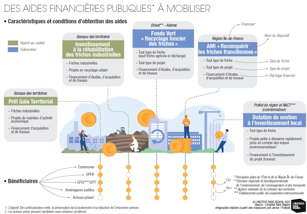 La Région Île-de-France a créé dès 2019 l’AMI « Reconquérir les friches franciliennes », ouvert à tout type de friche et cumulable avec le Fonds Vert, lancé en janvier 2023. Elle a ainsi contribué au financement de 127 projets (139 lauréats) sur les six premières sessions, pour un montant de plus de 51,3 millions d’euros de subventions. Les lauréats portant des projets à vocation exclusivement économique y sont très minoritaires. Ils représentent à peine plus de 5 % des projets soutenus par le dispositif entre 2020 et 2022. Pour autant, le dispositif a financé 21 projets mixtes (21 lauréats) dans les opérations d’aménagement soutenues, type ZAC. À la suite de la crise sanitaire, le Plan de relance national a permis de constituer un fonds de 650 millions d’euros alloués à la reconversion des friches. Ce Plan était constitué du Fonds Friches, doté de 589 millions d’euros consacrés au recyclage foncier pour des projets urbains. À l’échelle de l’Île-de-France, le Fonds Friches a permis de soutenir 103 projets sur près de 620 ha de friches, soit une subvention totale de 124,5 millions d’euros en 2021 et 2022. Dans ce Plan de relance, l’Ademe (l’agence de la transition écologique), qui accompagnait déjà les collectivités en la matière depuis 2010, pilotait le dispositif Reconversion des friches polluées, doté de 60 millions d’euros. Ces deux dispositifs d’aide ont été pérennisés par la mesure « Recyclage des friches » du Fonds Vert.